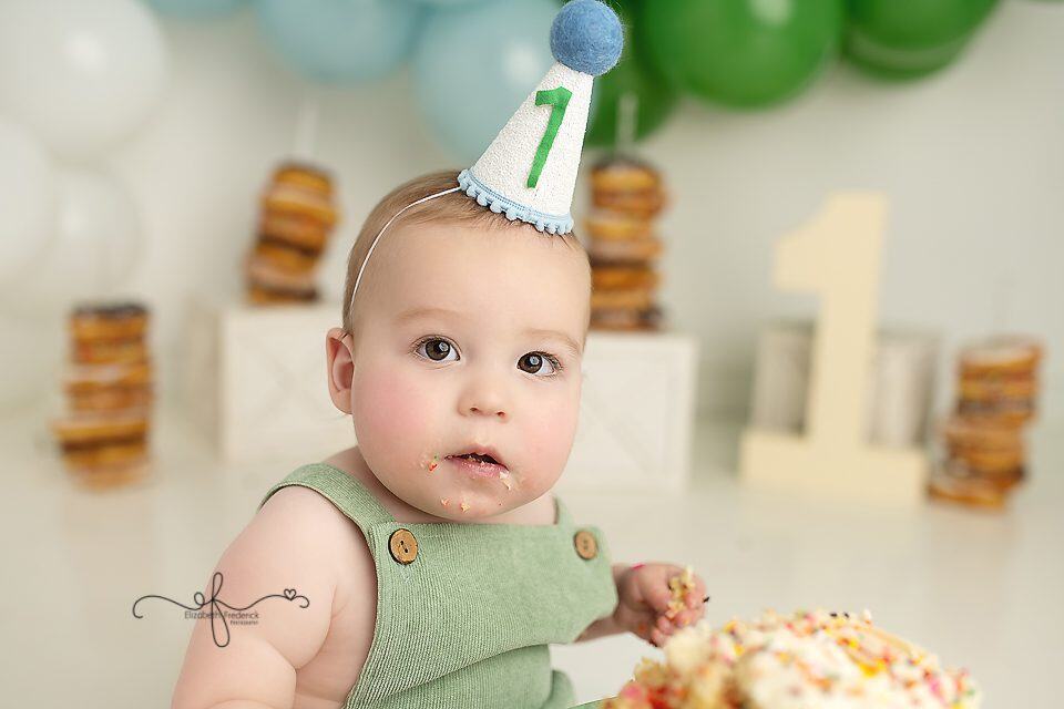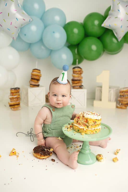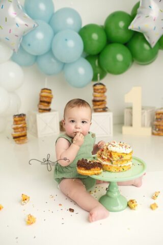 The smash cake for this session was from Crumbl, and it was the perfect size and texture for a first birthday celebration. The donuts featured in the setup were from Neil’s Donuts in Wallingford, CT, a local favorite known for their delicious and beautifully made donuts. Including these local treats added a fun, personalized touch to the session and tied the theme together perfectly.