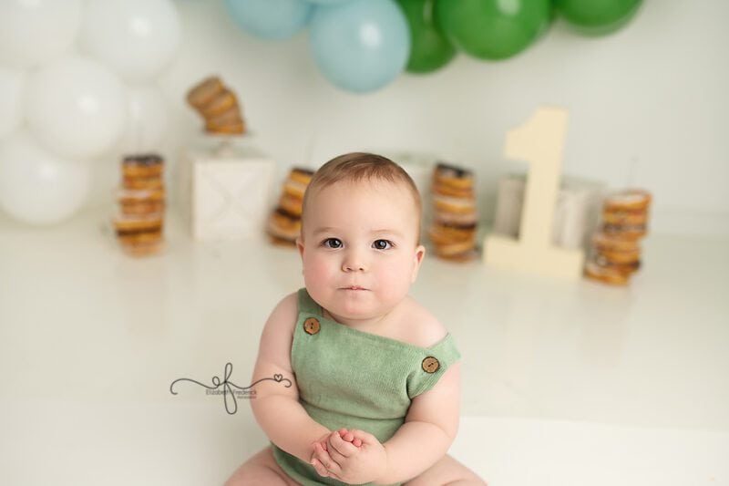 The smash portion of the session was relaxed and baby-led. From curious looks at the donuts to tiny hands exploring frosting and textures, every reaction was captured naturally. Some babies jump right in, while others take their time—and both make for meaningful milestone photos.