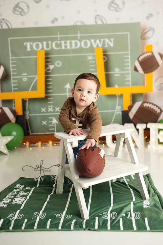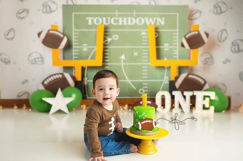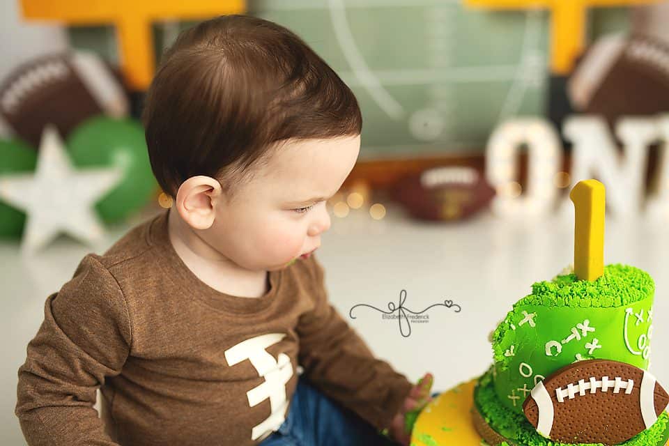 This football-themed “First Down” smash cake session was the perfect way to celebrate a very special first birthday. Smash cake sessions are such a fun and memorable way to capture your baby’s personality, and this one was full of sweet smiles, curiosity, and frosting-covered fingers.