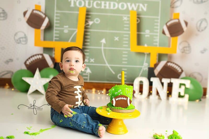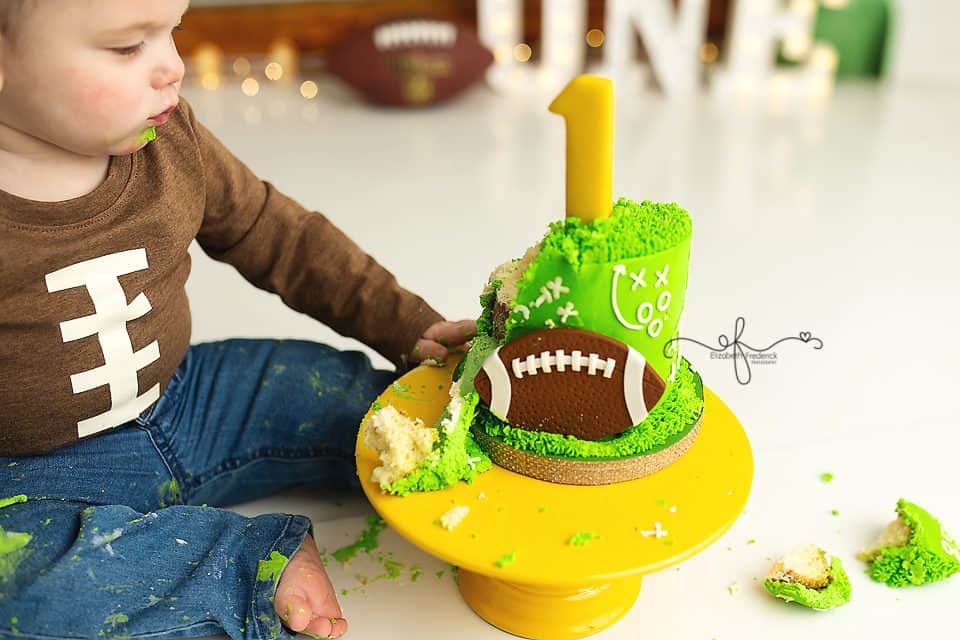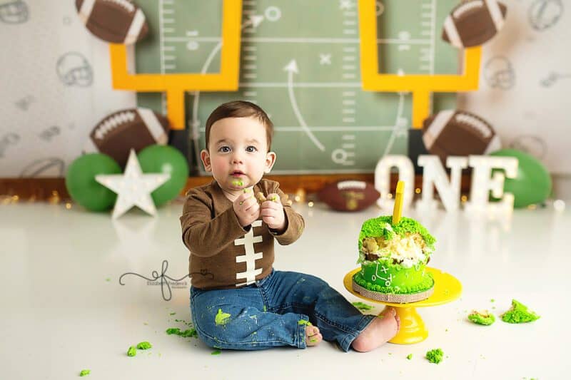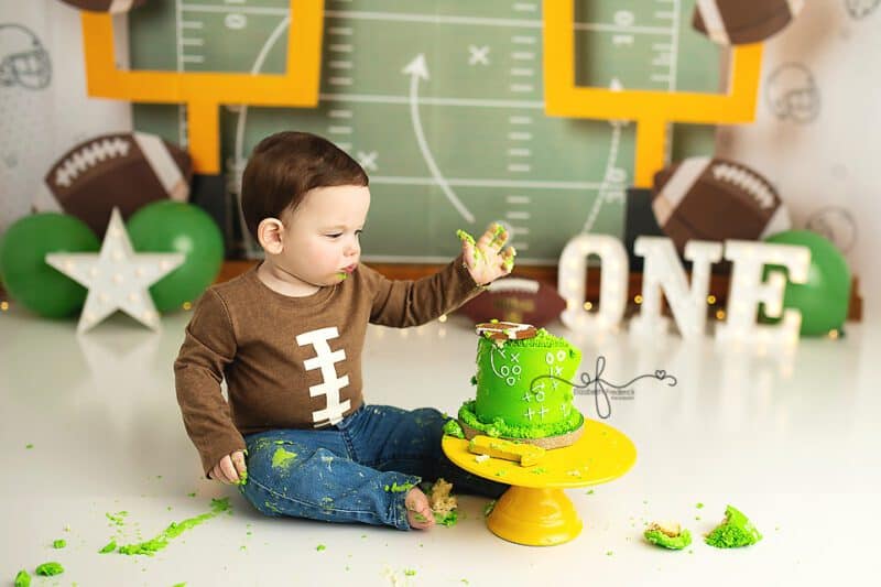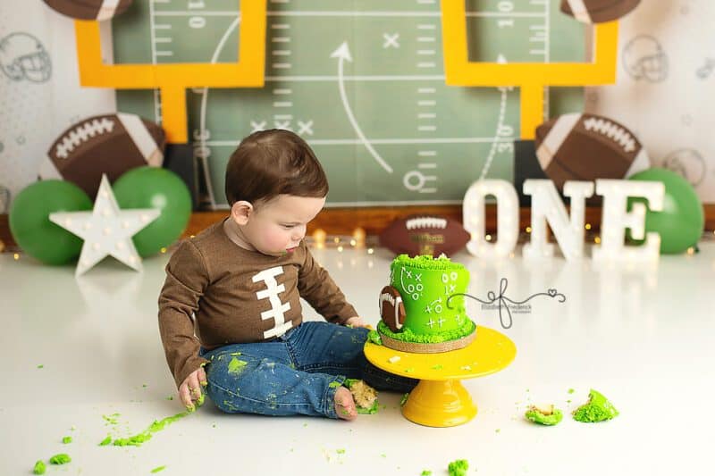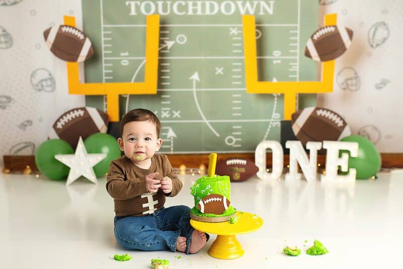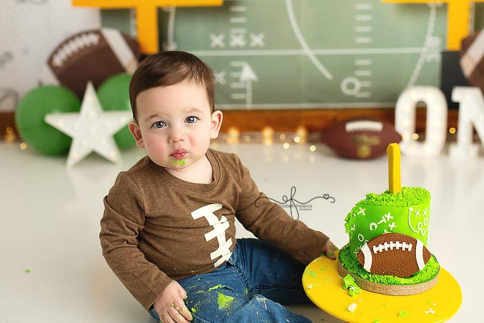 Football smash cake sessions are especially popular for families looking for a fun, meaningful theme that photographs beautifully.