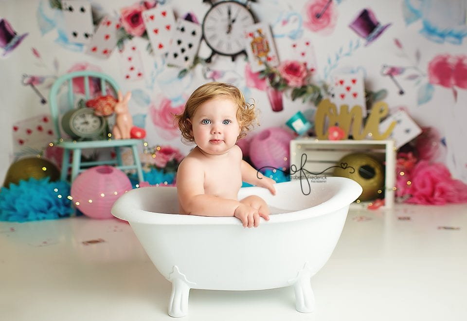 A very merry unbirthday to Ms. Abby who came to my studio for her smash cake session at 16 months fresh with CT Smash Cake Photographer Elizabeth Frederick Photography. Due to lockdown we had to postpone Abby’s first birthday celebration, but we were able to still celebrate with this fun Alice in Wonderland themed smash cake session. As you can tell, Abby had learned how to walk during quarantine. She was so busy running around the studio, but that didn’t stop us from having a good time and capturing these sweet photos of Abby. We finished up with a bath splash to clean up. She definitely loved that part of the session & brought out her smiles! Check out all of my favorite photos from her session & don’t forget to book your smash cake photography session today!